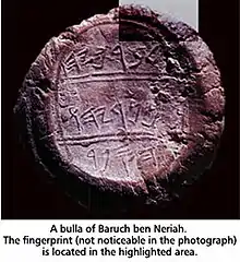 In 1996, a second clay bulla emerged with an identical inscription, presumably stamped with the same seal. This bulla was also imprinted with a fingerprint;[3] Hershel Shanks, among others, speculated that the fingerprint might be that of Baruch himself.[4] The authenticity of these bullae, however, has been disputed.ibid.