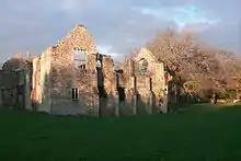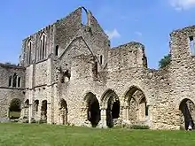 The refectory projected south from the centre of the range, as was usual in Cistercian monasteries.[24][26] This is now almost completely demolished save for the north wall, although the foundations survive underground and have been excavated.[24] It was a long hall with a dais for the abbot and important guests at the south end. There was a pulpit in the west wall to allow a monk to read to the community during the meal. The kitchen lies west; it had a central fireplace, as was Cistercian custom, and was placed to allow food to be served through hatches both to the choir monks' refectory and to the separate dining hall for the lay brothers on the west side.[24][27]