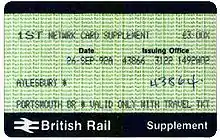 First Class supplement upgrade tickets were initially priced at a flat fare of £1.00 for both adults and children for any length of journey. This became £3.00 for adults and £1.50 for children in February 1990. The benefit was withdrawn upon the introduction of the first Network Railcard on 28 September 1997.[13]