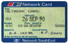 The Network SouthEast brand was introduced to what had been the London & South East sector of British Rail on 10 June 1986. The railcard was then introduced on 29 September 1986,[1] under the name Network Card. It offered a 34% discount on all off-peak fares for journeys wholly within the Network SouthEast area. Tickets valid at peak times, such as Day Returns and Open Returns, were excluded, as were First Class tickets (however, a supplement ticket could be bought to upgrade a discounted Standard Class ticket to First Class at weekends).[1] On weekdays, journeys had to start after 10.00am, but there were no time restrictions at weekends or on Bank Holidays. Up to three adults could accompany the railcard holder and gain the same discount, while up to four accompanying children could travel for a £1.00 flat fare. This version of the railcard could be issued for either one person or two people. On a two-person "joint-holder" ticket, either or both of the named holders could travel - that is, the card was transferable between the two.[2]