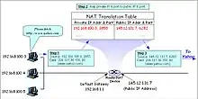 Network address translation (NAT) is a method of mapping an IP address space into another by modifying network address information in the IP header of packets while they are in transit across a traffic routing device.[1] The technique was originally used to bypass the need to assign a new address to every host when a network was moved, or when the upstream Internet service provider was replaced, but could not route the network's address space. It has become a popular and essential tool in conserving global address space in the face of IPv4 address exhaustion. One Internet-routable IP address of a NAT gateway can be used for an entire private network.[2]
