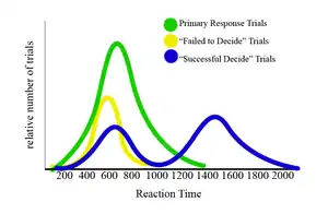 Those trials in which the subject reacted to the go-signal impulsively without seeing a subsequent signal show a quick RT of about 600 ms. Those trials in which the decide signal was shown too late, and the participant had already enacted their impulse to press the go-button (i.e. had not decided to do so), also show a quick RT of about 600 ms. Those trials in which a stop signal was shown and the participant successfully responded to it, do not show a response time. Those trials in which a decide signal was shown, and the participant decided not to press the go-button, also do not show a response time. Those trials in which a decide signal was shown, and the participant had not already enacted their impulse to press the go-button, but (in which it was theorised that they) had had the opportunity to decide what to do, show a comparatively slow RT, in this case closer to 1400 ms.[68]