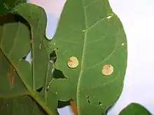 Schenck's gall is an oval shaped structure, about 0.1 × 0.2 cm and a light green colour, well camouflaged with the leaf lamina. A distinct indentation of the lamina margin is apparent through the inhibition of the normal growth of the leaf by the developing gall; the gall may also appear on the midrib.[1][2]