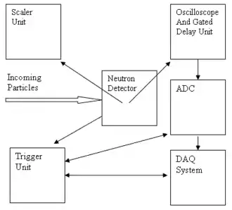 The detection signal from the neutron detector is connected to the scaler unit, gated delay unit, trigger unit and the oscilloscope. The scaler unit is merely used to count the number of incoming particles or events. It does so by incrementing its tally of particles every time it detects a surge in the detector signal from the zero-point. There is very little dead time in this unit, implying that no matter how fast particles are coming in, it is very unlikely for this unit to fail to count an event (e.g. incoming particle). The low dead time is due to sophisticated electronics in this unit, which take little time to recover from the relatively easy task of registering a logical high every time an event occurs. The trigger unit coordinates all the electronics of the system and gives a logical high to these units when the whole setup is ready to record an event run.