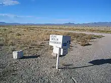 Descending the summit, SR 375 nears the border of the Nellis Air Force Range. As the highway heads northwest through Tikaboo Valley, it meets Mail Box Road. It used to be marked by a single postal drop known as the "black mailbox": the dirt access road leads to the restricted lands surrounding Area 51. The original mailbox was a normal black mailbox, however due to people constantly sifting through it, it was replaced with a white one that was much more secure. The name "Black Mailbox" still stuck. It was commonly used as a gathering place for UFO seekers,[3] and two to three UFO sightings per week allegedly occur in the area.[4] The mailbox was removed by its owner, Steve Medlin, due to continued vandalism.[5] SR 375 continues heading northwest from the mailbox, climbing in elevation again to reach the top of Coyote Summit at 5,591 feet (1,704 m).[2]