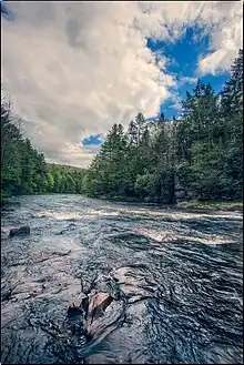 The Neversink Gorge is located in the town of Forestburgh, New York, USA, and is one of the more outstanding features of the Neversink River.[1] A portion of the western side of the gorge, above Denton Falls, through High Falls, to the entrance of Eden Brook, is a private nature sanctuary called The Turner Brook Reserve;[2] the entire eastern side and the remaining western property is a New York State Department of Environmental Conservation (DEC) controlled Unique Area, often called the Neversink Gorge Unique Area.[3]