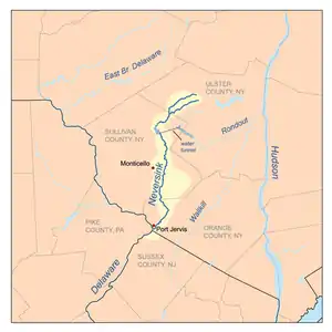 The Neversink River (also called Neversink Creek in its upper course) is a 55-mile-long (89 km)[1] tributary of the Delaware River in southeastern New York in the United States. The name of the river comes from the corruption of an Algonquian language phrase meaning "mad river."