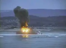 Since the vessel was no longer seaworthy and could not move under its own power, even if freed from the beach, the focus of the operation changed. Oil from the ship's fuel tanks continued to pose an environmental hazard, a situation exacerbated by both the ship's structural failure and continuing pounding from the surf. In order to mitigate the damage the Unified Command decided to set the fuel tanks on fire in order to burn off the oil. The first attempt was made on 10 February. Napalm and other incendiary devices were used to ignite the fuel, but only one of the diesel tanks was burned effectively. A second attempt was made on 11 February when US Navy explosive experts placed 39 shaped charges to breach the top of the fuel tanks from within the cargo holds. 602 U.S. gallons (2,280 L) of napalm and nearly 397 pounds (180 kg) of plastic explosives were also used to ignite the fuel on board. The ship burned for approximately 33 hours.[12] Additional smaller-scale attempts were made to burn more oil over the next two days, with limited success. The total amount of oil that was burned is estimated to be between 165,000 and 255,000 US gallons (620 and 970 m3).[12] The structural stress caused by the fire, combined with continued severe weather, caused the vessel to break into two sections around midnight on 11 February.
