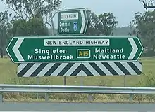 With Queensland's conversion to the newer alphanumeric system in 2005, National Route 42 and State Route 61 were removed and replaced by route A3 between Yarraman and Warwick, now running concurrent with State Route 85 between Hampton and Toowoomba, and National Highway 15 was updated to route A15 between Warwick and the state border with New South Wales. New South Wales' conversion to the newer alphanumeric system occurred later in 2013, with National Highway 15 also updated to route A15 from the state border with Queensland to Hexham.[31] With Hunter Expressway opening a year later in 2014, route A15 was modified to route M15 and rerouted along it east of Branxton, and route A43 was extended westwards from Hexham along New England Highway to replace it, retaining a concurrency with route A1 between Beresfield and Hexham.