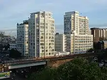 Beyond the railway bridge stands Albert Barnes House, an 18-storey block of council flats owned by the London Borough of Southwark. From 1883 to 1886, this was the site of a fish and provisions market promoted by Samuel Plimsoll.[3] Albert Barnes House was completed in 1964 and contains 99 flats. There was a serious fire in Albert Barnes House in the early hours of 30 January 2007 and all 250 residents were evacuated. One flat was gutted, and another seriously damaged [16]