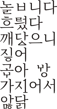 There were other changes that made the orthography more morphemic, without requiring the addition of new letters. For example, in the word normally spelled 놉니다 (top example in image at right), the politeness morpheme ㅂ is separated out in its own block. Such spellings can be found in medieval documents, but were not normally seen in the 20th century.