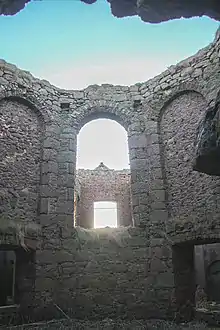 The defensive works of the castle include the use of the North Sea cliffs; an abyss to the west that functions as a deep impassable moat; and a ruined rampart that would have been the main entrance on the south.[17] The ruins include reasonably well-preserved elements of three- and four-storey structural elements and a basement course over some of the range, especially at the eastern side. There are well-preserved basement kitchen works with numerous fire pits and masonry indented storage spaces. The internal doorways are primarily of well-preserved wooden lintel construction, with numerous examples of mortared sandstone and medieval brickwork archways. The interior of the ground level is a maze of passageways and smaller rooms, reflecting a high state of occupancy in 17th-century times.