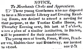 The foundation of the Mercantile Library Association was instigated by the New York Chamber of Commerce,[5] which placed newspaper advertisements in November 1820 asking merchant clerks to meet at a local coffee house to discuss forming an organization based on the Mercantile Library in Boston, which had been created earlier that year.[4] The purpose of the new organization was to provide the city's growing population of clerks with an alternative to what were considered to be immoral entertainments and other vices of the city.[5][6]