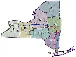 The NYSP divides New York state geographically into eleven "Troops," each comprising a specific geographic area, usually several counties. Each is supervised by a "Troop Commander" usually of the rank of Major.[8] NYSP Troops cover the following counties and regions as listed: