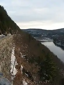 The Delaware River corridor had been linked by a road along the cliffs overlooking the river since at least 1851. Part of it was constructed in the early 1800s as part of the Newburgh and Chenango Turnpike, chartered in 1805 to create a road from the Newburgh and Cochecton Turnpike up the Delaware River to Hancock, thence to Deposit, Bainbridge, and Oxford.[6] When the plans for a new highway through the corridor of NY 97 were initially drawn up, it was to bypass what became the Hawk's Nest in favor of a shoreline route. However, the Erie Railroad refused to sell the necessary right-of-way, forcing the state to construct the improved road along the cliffside instead.