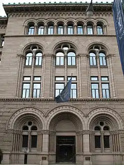 The Newberry's first librarian, William Frederick Poole, was a major figure in the library world when he came to the Newberry. Poole saw the Newberry as a blank canvas on which he could project his ideas, which included and perhaps found their most impassioned articulation in the design and construction of libraries. In 1887–88 it was located at 90 La Salle Street, in 1889–90 at 338 Ontario Street, and in 1890-93 at the northwest corner of State and Oak Streets. The present building, designed by Poole[2] and architect Henry Ives Cobb (1859–1931), opened in 1893. It is located at 60 West Walton Street, across from Washington Square. It is a structure in the Spanish Romanesque architectural style, built of Connecticut granite.[3]