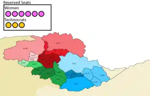- Six seats are reserved for women, three seats are reserved for technocrats.