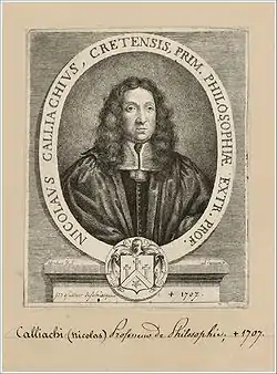 Nicholas Kalliakis (Greek: Νικόλαος Καλλιάκης, Nikolaos Kalliakis;[2] Latin: Nicolaus Calliachius; Italian: Niccolò Calliachi; c. 1645[3] - 8 May 1707) was a Cretan Greek[4] scholar and philosopher who flourished in Italy in the 17th century. He was appointed doctor of philosophy and theology in Rome,[5] university professor of Greek and Latin[6] and Aristotelian philosophy[7] at Venice in 1666 and professor of belles-lettres[8] and rhetoric[9] at Padua in 1667.