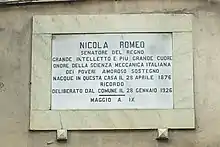 Nicola Romeo (Italian pronunciation: [niˈkɔːla roˈmɛːo]; Sant'Antimo, 28 April 1876 – Magreglio, 15 August 1938) was an Italian engineer and entrepreneur mostly known for founding the car manufacturer Alfa Romeo. He served as a senator in the 18th Legislature of the Kingdom of Italy.