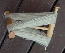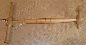 A niddy-noddy (plural niddy-noddies[1]) is a tool used to make skeins from yarn. It consists of a central bar, with crossbars at each end, offset from each other by 90°. The central bar is generally carved to make it easier to hold.[2] Either one of the crossbars will have a flat edge to allow the skein to slide off, or will be completely removable. Niddy-noddies can be constructed of many different materials including wood, metal, and plastic. Wood is traditional, and most quality niddy-noddies are still made of wood. Budget spinners occasionally use niddy-noddies made from PVC pipes.