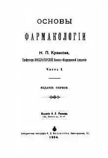 «Fundamentals of Pharmacology» by Professor Kravkov had 14 editions — in 1904-1905, 1907, 1909-1910, 1911, 1913, 1915, 1917, 1918, 1925-1927, 1926-1927, 1927, 1927-1928, 1928, 1930-1931 and 1933 (every succeeding edition was rearranged by the author, the last two editions were actualized by Professor Savich). Nikolai Kravkov's book became the fundamental textbook for a few generations of Russian pharmacologists.