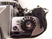 - A vertical shutter speed scale with LEDs to indicate both the user selected and camera suggested shutter speed (in 'M' mode) and the value selected ('P' and 'A' modes) by the camera's metering system.