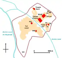 Nippur (Sumerian: Nibru, often logographically recorded as 𒂗𒆤𒆠, EN.LÍLKI, "Enlil City;"[1] Akkadian: Nibbur) was an ancient Sumerian city. It was the special seat of the worship of the Sumerian god Enlil, the "Lord Wind", ruler of the cosmos, subject to An alone. Nippur was located in modern Nuffar in Afak, Al-Qādisiyyah Governorate, Iraq. It is roughly 200 kilometers south of modern Baghdad and about 60 miles southeast of the ancient city of Babylon. Occupation at the site extended back to the Ubaid period (Ubaid 2 - Hajji Muhammed), the Uruk period, and the Jemdet Nasr period.