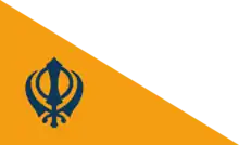 The Nishan Sahib (Gurmukhi: ਨਿਸ਼ਾਨ ਸਾਹਿਬ niśāna sāhiba) is a Sikh triangular flag made of cotton or silk cloth, with a tassel at its end. The word, Nishan Sahib means exalted ensign, and the flag is hoisted on a tall flagpole, outside most Gurdwaras. The flagpole itself, covered with fabric, ends with a Khanda on top (In the past an Astbuj, nagani barsha or a teer would be placed on top). The emblem on the flag is known as Khanda, which depicts a double-edged sword called a khanda (Miri te Piri) (☬) in the centre, a chakkar which is circular, and flanked by two single-edged swords, or kirpans. Almost all Sikh warriors used to wear it in the eighteenth century, and Nihangs of today still do. The Khanda Sahib is not to be confused with the Nihang's Aad Chand which was the first symbol of the Khalsa. The Khanda was not introduced by Guru Hargobind Sahib Ji but it was a plain yellow banner.
