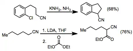 Examples of arylation and acylation reactions are shown below. Although intermolecular arylations using nitrile anions result in modest yields, the intramolecular procedure efficiently gives four-, five-, and six-membered benzo-fused rings. Acylation can be accomplished using a wide variety of acyl electrophiles, including carbonates, chloroformates, esters, anyhdrides, and acid chlorides.[10] In these reactions, two equivalents of base are used to drive the reaction towards acylated product—the acylated product is more acidic than the starting material.