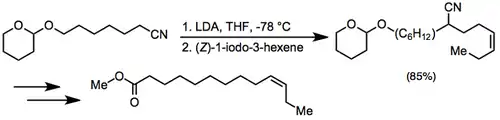 Alkylation of a nitrile anion followed by reductive decyanation was employed in the synthesis of (Z)-9-dodecen-1-yl acetate, the sex pheromone of Paralobesia viteana.[13]