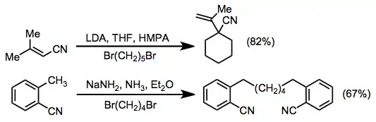 Polyanions of nitriles can also be generated by multiple deprotonations, and these species produce polyalkylated products in the presence of alkyl electrophiles.[12]
