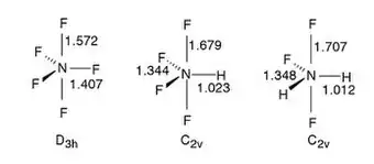 4F−). This was made by treating nitrogen trifluoride and fluorine with 3 MeV electron radiation at 77 K. It decomposed above 143 K back into those ingredients.[2] Theoretical studies also show the ionic compound is very likely to decompose to nitrogen trifluoride and fluorine gas.[3]