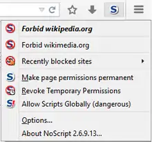 NoScript's interface, whether accessed by right-clicking on the web page or the distinctive NoScript box at the bottom of the page (by default), shows the URL of the script(s) that are blocked, but does not provide any sort of reference to look up whether or not a given script is safe to run.[10] With complex webpages, users may be faced with well over a dozen different cryptic URLs and a non-functioning webpage, with only the choice to allow the script, block the script or to allow it temporarily.