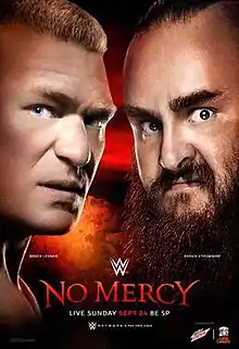 At SummerSlam, Brock Lesnar defeated Braun Strowman, Roman Reigns, and Samoa Joe in a fatal four-way match to retain the Universal Championship.[8] The following night on Raw, Lesnar's victory celebration with his advocate Paul Heyman was interrupted by Strowman, who attacked Lesnar with a Chokeslam and two Running Powerslams. Later on the show, a Universal Championship title match between the two was scheduled for No Mercy.[9] The following week, Lesnar and Heyman issued a warning to Strowman.[10] On the September 4 episode, after Strowman defeated Big Show in a Steel Cage match, Strowman also warned Lesnar before throwing Big Show through the cage.[11] In a confrontation the following week, Lesnar attacked Strowman with a German Suplex but Strowman quickly performed a Chokeslam and Running Powerslam on Lesnar, hoisting the title over Lesnar.[12] In a split-screen interview on the final Raw before No Mercy, Lesnar thanked Strowman for being a "great challenge", stating that is when he is at his best.[13]
