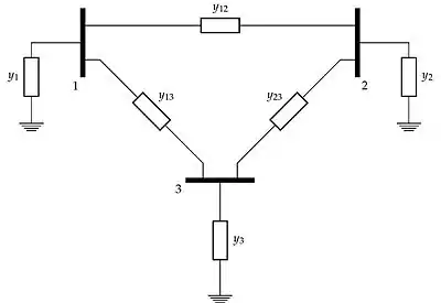 The Y Matrix diagonal elements are called the self-admittances at the nodes, and each equals the sum of all the admittances terminating on the node identified by the repeated subscripts. The other admittances are the mutual admittances of the nodes, and each equals the negative of the sum of all admittances connected directly between the nodes identified by the double subscripts. The admittance matrix is typically a symmetric matrix as . However, extensions of the line model and models of other components may make asymmetrical.[2] An example being a phase-shifting transformer, which will cause to become asymmetrical.