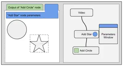 Visually nodes are often represented by rectangles. However, this is not a convention that is followed by all applications. In the diagram above there are three nodes labeled "Video", "Add Star" and "Add Circle".