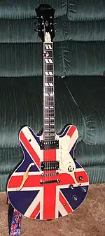 Comparing himself to other guitarists, Gallagher stated, "I can barely play like Peter Green, let alone fucking Jeff Beck."[129] He also said, "I'm unfortunate enough that two of my best mates are Johnny Marr and Paul Weller. Those two are virtuosos to me although neither of them would admit it. On the electric guitar they're it. So if you're asking me how do I compare to those two—and I like to compare myself to the greats—I'm average at fucking best." Weller described Gallagher's ability as a guitarist as "rudimentary", saying, "Noel doesn't pretend to be a guitar god. He's very good at putting chords together and he's got a distinctive style in terms of his chord sequences and his rhythm playing. It's recognisable."[131] Though naturally left-handed, Gallagher plays guitar right-handed, which he claims is the only thing he can do with his non-dominant hand.[132]