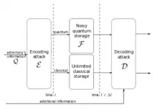 The latter assumption also implies that he can perform any form of error correcting encoding before and after using the noisy memory device, even if it is computationally very difficult to do (i.e., it requires a long time). In this context, this is generally referred to as an encoding attack and a decoding attack . Since the adversary's classical memory can be arbitrarily large, the encoding may not only generate some quantum state as input to the storage device but also output classical information. The adversary's decoding attack can make use of this extra classical information, as well as any additional information that the adversary may gain after the waiting time has passed.