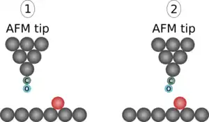 During the pick-up, the CO molecule orients itself such that the carbon atom attaches to the metal probe tip.[38][39] The CO molecule, due to its linear structure, can bend while experiencing varying forces during the scanning, as shown in the figure. This bending appears to be a major cause for the contrast improvement,[34][36] although it is not a general requirement for atomic resolution for different tip terminations such as a single oxygen atom, which exhibits negligible bending.[40] Additionally, the bending of the CO molecule adds its contribution to the images, which may cause bond-like features in locations where no bonds exist.[36][41] Thus, one should be careful while interpreting the physical meaning of the image obtained with a bending tip molecule such as CO.