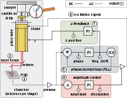 Non-contact atomic force microscopy (nc-AFM), also known as dynamic force microscopy (DFM), is a mode of atomic force microscopy, which itself is a type of scanning probe microscopy. In nc-AFM a sharp probe is moved close (order of Angstroms) to the surface under study, the probe is then raster scanned across the surface, the image is then constructed from the force interactions during the scan. The probe is connected to a resonator, usually a silicon cantilever or a quartz crystal resonator. During measurements the sensor is driven so that it oscillates. The force interactions are measured either by measuring the change in amplitude of the oscillation at a constant frequency just off resonance (amplitude modulation) or by measuring the change in resonant frequency directly using a feedback circuit (usually a phase-locked loop) to always drive the sensor on resonance (frequency modulation).