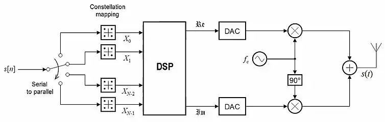 A Digital Signal Processor (DSP) is computed on each set of symbols, giving a set of complex time-domain samples. These samples are then quadrature-mixed to passband in the standard way. The real and imaginary components are first converted to the analogue domain using digital-to-analogue converters (DACs); the analogue signals are then used to modulate cosine and sine waves at the carrier frequency, , respectively. These signals are then summed to give the transmission signal, .