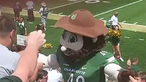 Norm the Niner is the athletics mascot of the University of North Carolina at Charlotte. Norm is a student dressed in appropriate Charlotte 49ers athletics uniforms with a headpiece. Norm made his debut in 1962 after a student vote in November 1961 to change the mascot, with periodic updates to design and wardrobe occurring in the years since. Norm is rarely seen without his trusty pick-axe and never takes his slouch hat off. As a member of the spirit squad, Norm the Niner travels with the cheerleaders to away athletics events, to many events around the university and often makes appearances around Charlotte and the surrounding region. [1][2]