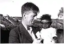 In 1938–39, Tindale teamed up with Joseph Birdsell, an anthropological graduate student, who was under Earnest Hooton of Harvard University, after meeting the pair on a 1936 visit to the US.[10] They were to undertake an extensive anthropological survey of Aboriginal reserves and missions across Australia, and the relationship forged between the two developed into a half century of collaboration.[1] Tindale would study the genealogies, while Birdsell undertook the measuring, and with government support the pair travelled across south-east Australia, parts of Queensland, Western Australia, and Tasmania. In May 1938, the two men and their wives visited Cummeragunja Aboriginal reserve in New South Wales.[10] A later study looking at their 1939 expedition to the Cape Barren Island Aboriginal reserve said that this contributed to their decision to advocate assimilation ("absorption") as a solution to "the half-caste problem".[11]