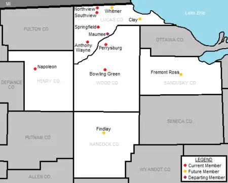 On April 9, 2021, invitations were extended to four schools that are currently members of the Three Rivers Athletic Conference, starting with the 2023-2024 school year: Findlay, Fremont Ross, Oregon Clay, and Whitmer.[1]