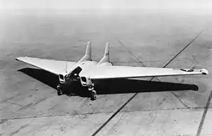 The pilot controlled the XP-79 through a tiller bar and intakes mounted at the wingtips supplied air for the unusual bellows-boosted split elevons which opened differentially to provide lateral (yaw) control, by increasing drag on one side of the aircraft, in addition to providing roll and pitch.[2] The aircraft was also fitted with airbrakes outboard of them, also for yaw control. No rudders were used, and the vertical surfaces were simple fixed fins with no flight controls.
