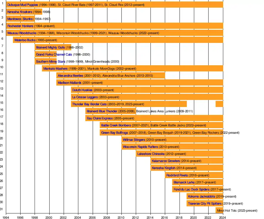 The teams are located in the Northwoods region of the Upper Midwestern United States and Northwestern Ontario, mostly in the U.S. states of Minnesota (five teams) and Wisconsin (nine teams); also with three teams in Michigan, two in North Dakota, and one team each in Iowa, Illinois, Indiana and Ontario.