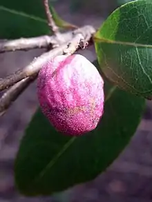 It is a shrub or small tree capable of growing up to 16 metres tall, with a trunk diameter of 80 cm. It features dull, hairless leaves that are 3 to 10 cm long and 10 to 25 mm wide. Leaf stems are purple in colour and 2 to 5 mm long. From January to April, greenish yellow flowers form racemes extending from the leaf axils . Relatively large fruit mature from summer to Easter, and are up to 10 mm in diameter. These fruits are generally a shade of pink, varying from white to a dark purple. Though edible and often heavy yielding, the fruit have a large pip and a strong, bitter taste which gives them little food value.