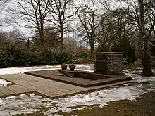 The still existing “monument to the monument” is a small commemorative artefact erected in May 1983 through a spontaneous self-financed initiative by Architect Günther Stahn and Sculptor Gerhard Thieme in order to mark the exact place, where once Mies´monument stood. The original idea to build an exact replica of the original monument had in fact been rejected by the cemetery direction due to its excessive size.[8]