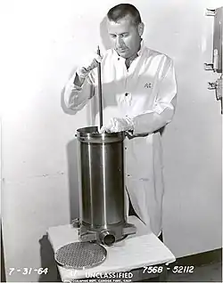 The occupational health studies of the Los Alamos National Laboratory and surrounding communities show elevated levels of certain disease rates among workers.[132] A plutonium core for a nuclear weapon, nicknamed the "Demon Core" was involved in two accidents at LANL in 1945 and 1946, leading to the acute radiation poisoning and later the deaths of scientists Harry Daghlian and Louis Slotin. The first criticality incident occurred on August 21, 1945, when physicist Harry Daghlian accidentally dropped the core, causing a burst of neutron radiation that contaminated him and a security guard, Private Robert J. Hemmerly.[133] The second incident caused the death of physicist, Louis Slotin, and contaminated seven other employees.[134][135]