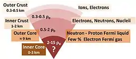 Some authors use "nuclear matter" in a broader sense, and refer to the model described above as "infinite nuclear matter",[1] and consider it as a "toy model", a testing ground for analytical techniques.[8] However, the composition of a neutron star, which requires more than neutrons and protons, is not necessarily locally charge neutral, and does not exhibit translation invariance, often is differently referred to, for example, as neutron star matter or stellar matter and is considered distinct from nuclear matter.[9][10] In a neutron star, pressure rises from zero (at the surface) to an unknown large value in the center.